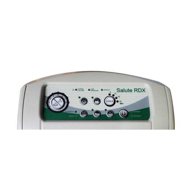This micro low air loss mattress system utilizes 18 8” combined air cells (4.5” therapy + 3.5” static air) to ensure support even in the event a power loss. The static air cell eliminates the need for a foam base, which means the whole surface can be easily disinfected. The Salute RDX pump powers the advanced 3-1 alternation, which provides active pressure relief: for every three cells, one cell alternates in deflation, off-loading pressure on the body and ensuring 2/3 of the body is always supported at any time.